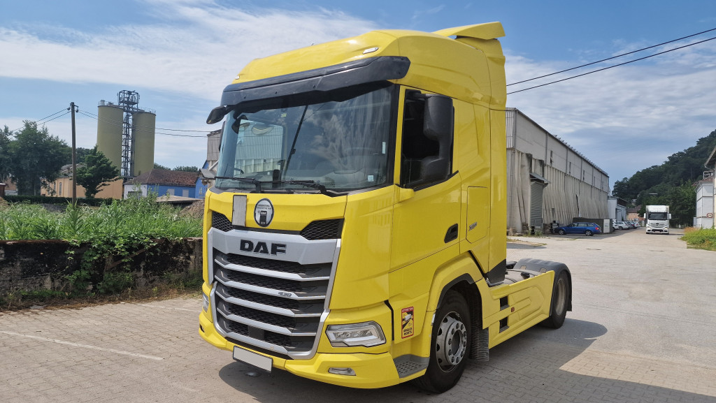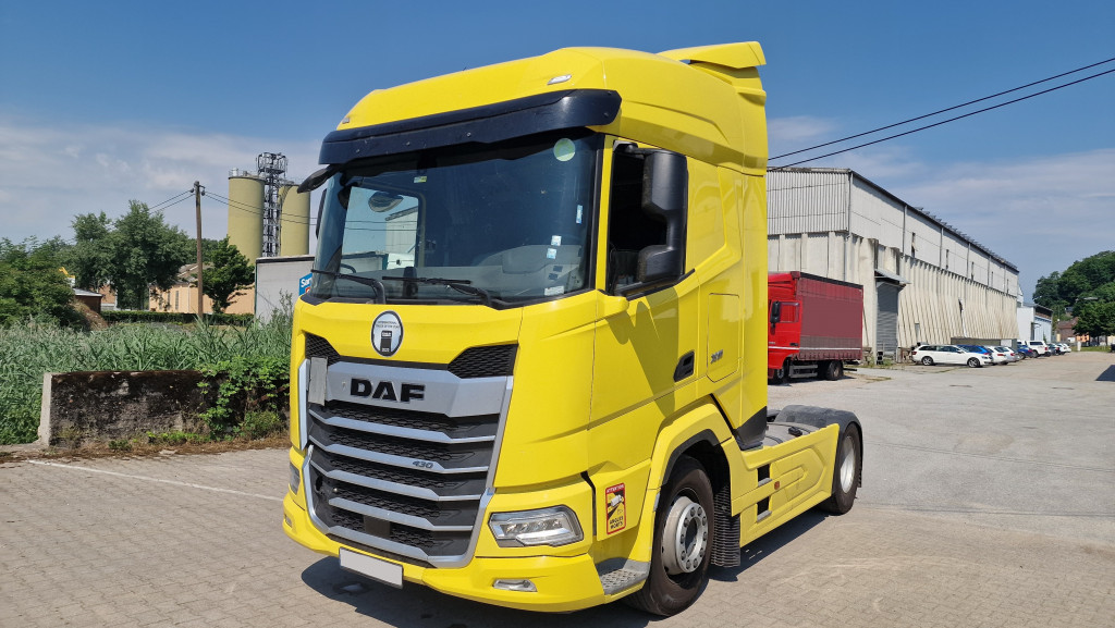 DAF XF430FT NGD tractor unit, New generation Space cab, Emissions class Euro 6e, Wheel configuration 4x2, Automatic transmission, Engine brake, 2 Tanks, total capacity 1,240 l, Cruise control, 2 Beds, Parking heater, Air condition, Fridge, Leaf/air suspension, Unladen weight 8,024 kg, Wheelbase 3,80 m, Tires 12/13 mm, 1st Hand